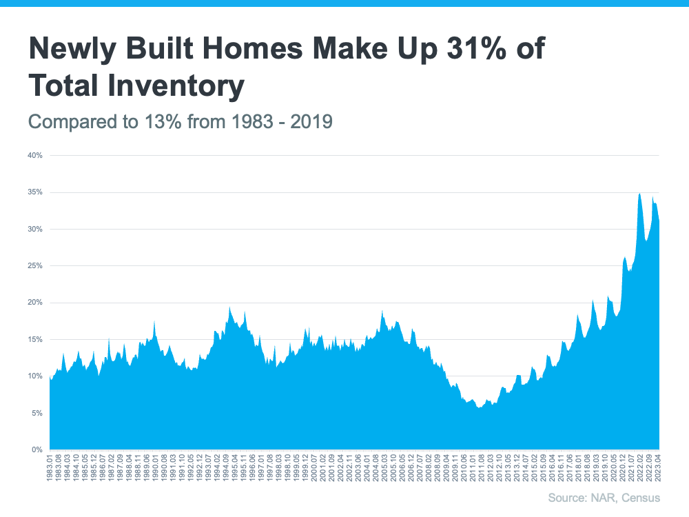 In fact, as the data shows, newly built homes now make up 31% of the total for-sale inventory. Over the past couple of decades, newly built homes made up an average of only around 13% of total housing inventory from 1983 to 2019.