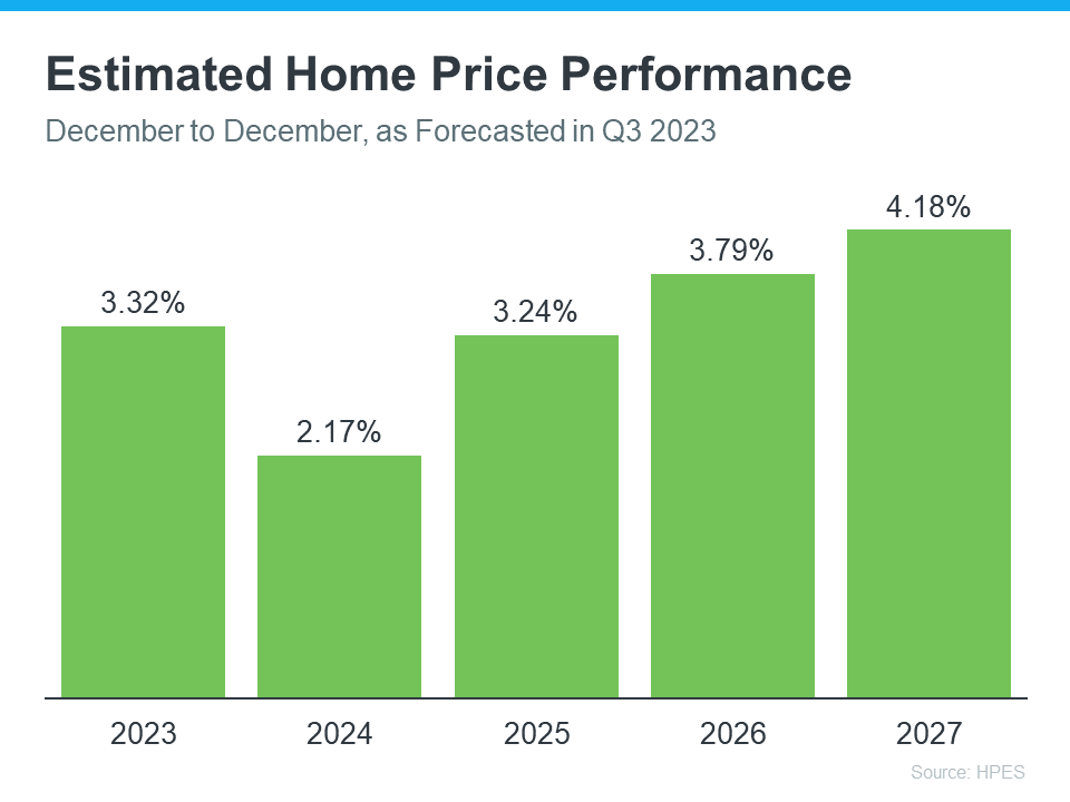 The Home Price Expectation Survey (HPES) from Pulsenomics is a great resource to show what experts forecast for home prices over a five-year period. It includes projections from over 100 economists, investment strategists, and housing market analysts. And the results from the latest quarterly release show home prices are expected to go up every year through 2027 (see graph below):