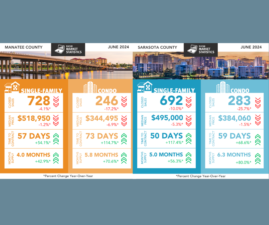 SARASOTA, Fla. (July 23, 2024) – The REALTOR® Association of Sarasota and Manatee (RASM) released its monthly market report detailing the real estate trends for June 2024. According to the data compiled by Florida Realtors®, the data highlights a trend towards a more balanced market across both counties, with increasing inventory levels and more moderate price changes. The shift in inventory suggests that buyers may find more opportunities, while sellers may need to adjust expectations in light of the growing competition.